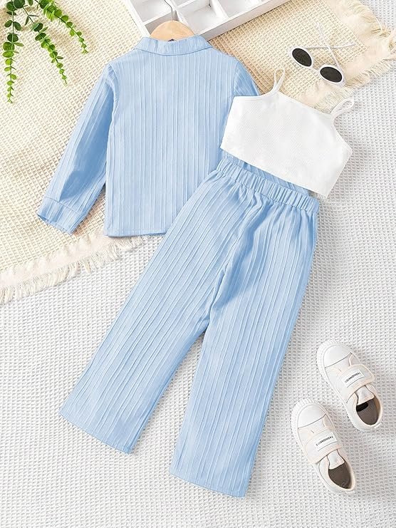 Girls’ 3-Piece Casual Outfit Set – Ribbed Top, Pants & Inner Camisole